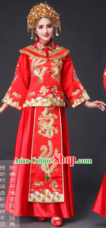 Chinese Traditional Xiuhe Suit Longfeng Flown Ancient Embroidered Red Wedding Dress for Women